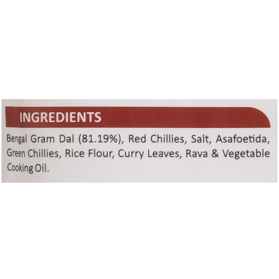Bengal Gram Dal, Red Chillies, Salt, Asofoetida, Green Chillies, Rice Flour, Curry Leaves, Coriander Leaves, Rava, and Vegetable Cooking Oil