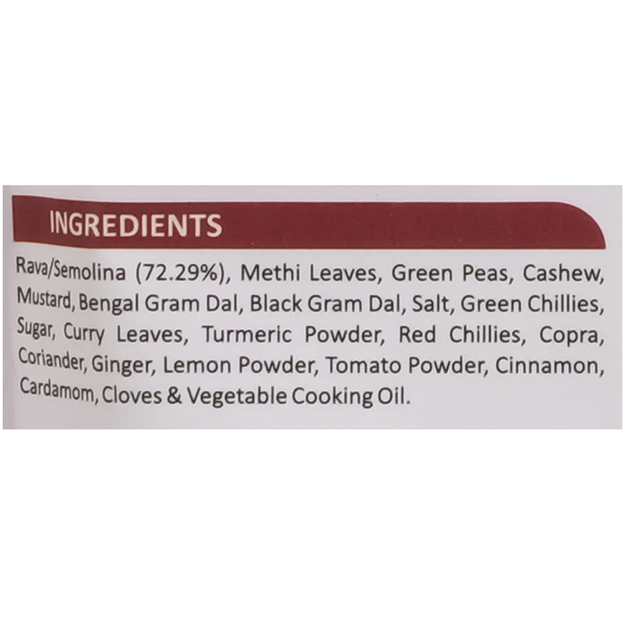 Rava, Methi Leaves, Green Peas, Cashew Nuts, Mustard, Bengal Gram Dal, Black Gram Dal, Salt, Green Chillies, Sugar, Curry Leaves, Turmeric, Tomato Powder, Red Chillies, Copra, Coriander, Ginger, Lemon Powder, Cinnamon, Cardamom, Cloves, and Vegetable Cooking Oil