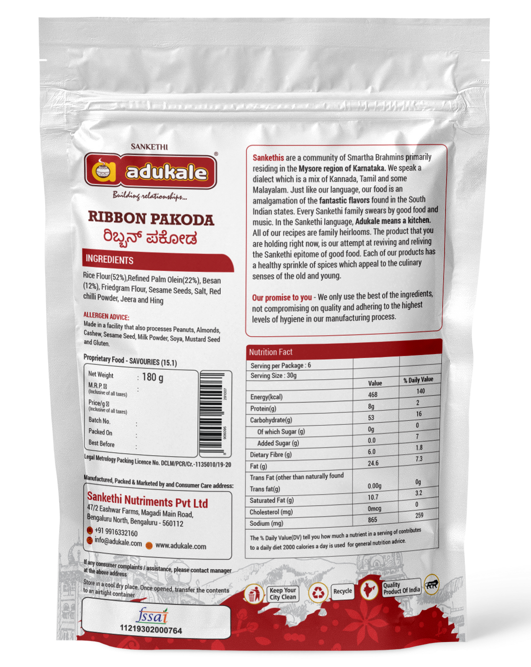 Craving a savory snack? Try Adukale’s Ribbon Pakoda Snacks, also known as ribbon-shaped crunchy fritters. This popular South Indian snack is made with gram flour and spices and is perfect for snacking on the go or enjoying with a cup of tea. Get Adukale’s Ribbon Pakoda Snacks now and satisfy your cravings!