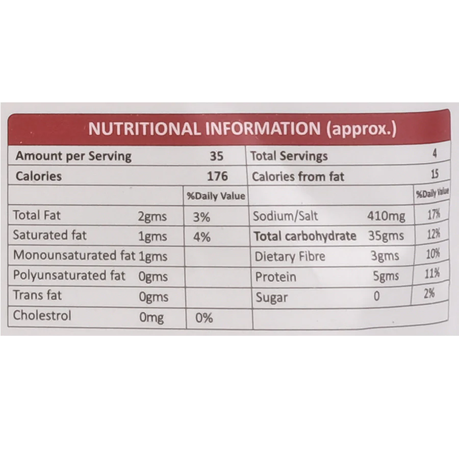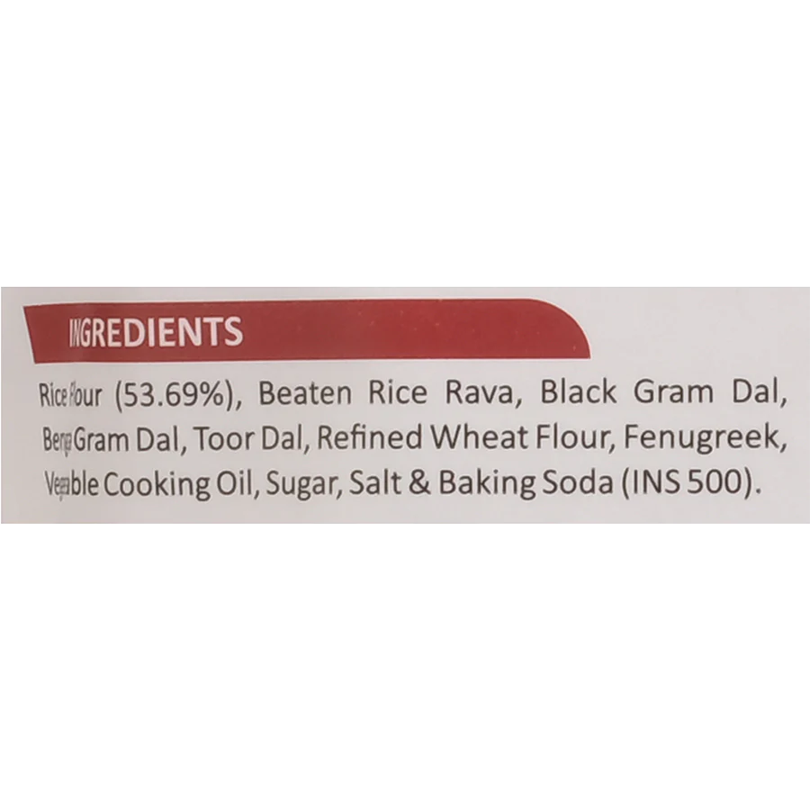 Rice Flour, Beaten Rice, Rava, Black Gram Dal, Bengal Gram Dal, Tur Dal, Refined Wheat Flour, Fenugreek, Vegetable Cooking Oil, Salt, Sugar, and Baking Soda