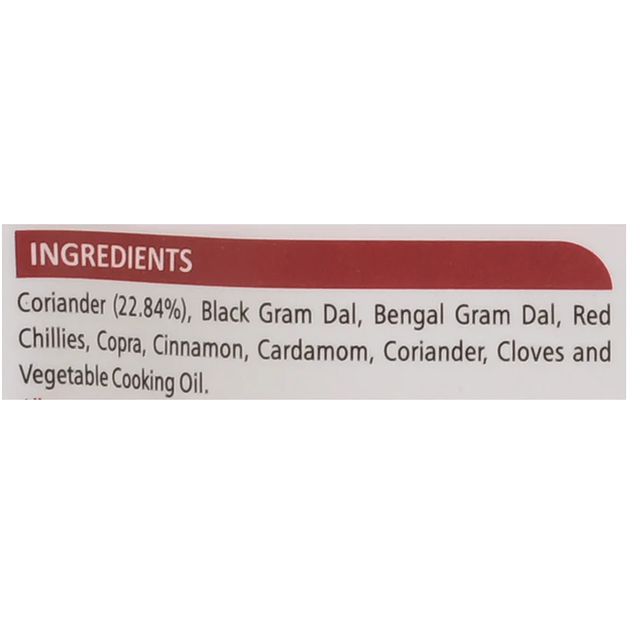 Black Gram Dal, Bengal Gram Dal, Red Chillies, Copra, Black Pepper, Cinnamon, Cardamom, Coriander, Cloves, and Vegetable Cooking Oil
